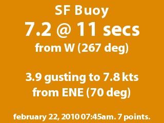 This one gathers wind and wave data from the San Francisco buoy and the Fort Funston wind meter and tries to come up with a rating for how good the surf is around San Francisco. As the surf gets better, the color of the graphic changes.