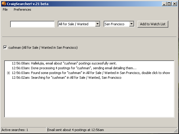 As you can see it found 4 postings for "cushman" in the San Francisco "All for Sale / Wanted" category and emailed me a status report, which has links to each ad and any pictures from the ads attached.