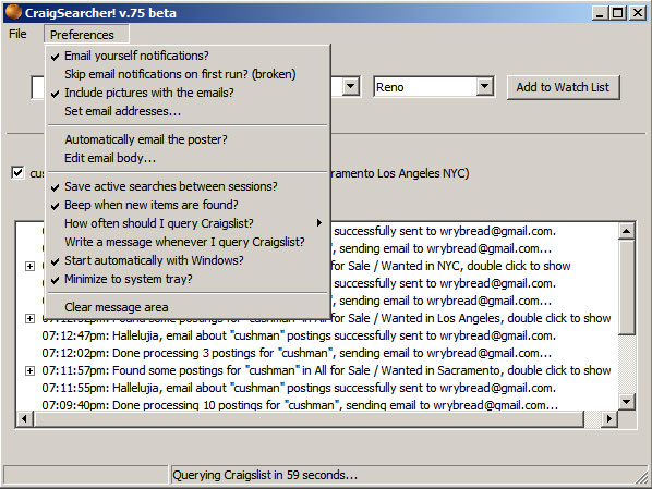 In this screenshot you can see the preferences. Most of them are pretty self explanatory, but note that you need to click "set email addresses" to tell it where to email the ads. I repeat: you need to click "set email addresses" before it'll be able to email you anything.