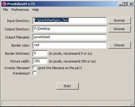 I think most of the options are self explanatory, but a couple of notes: checking "randomize" causes the pictures to be added in random order as opposed to alphabetically. And in the preferences menu is the option "Include Subdirectories", which makes Proofsheet look in subdirectories of the input directory. And "Create Text Files" tells Proofsheet to create a sort of text file map that details which pic is in which frame of the proofsheet.